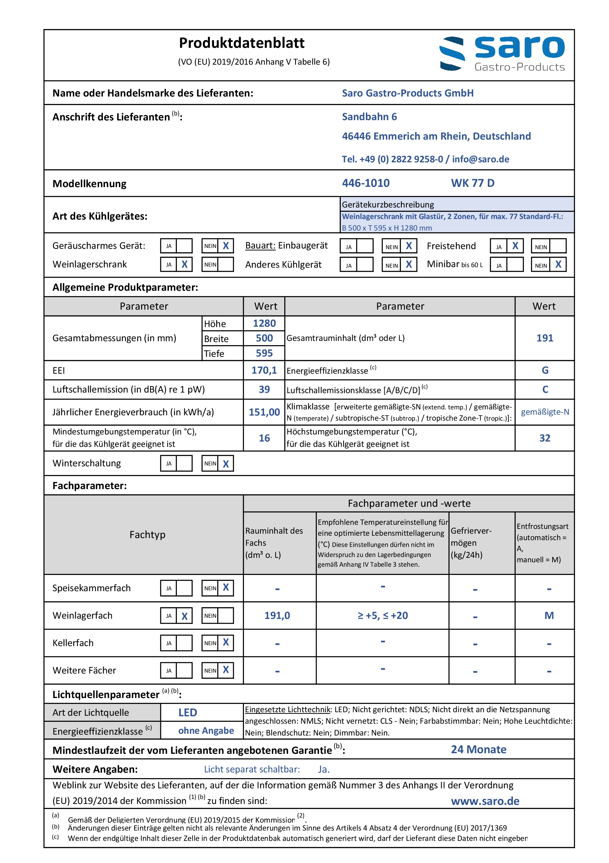 SARO Wijnkoelkast, 2 zones, model WK 77D